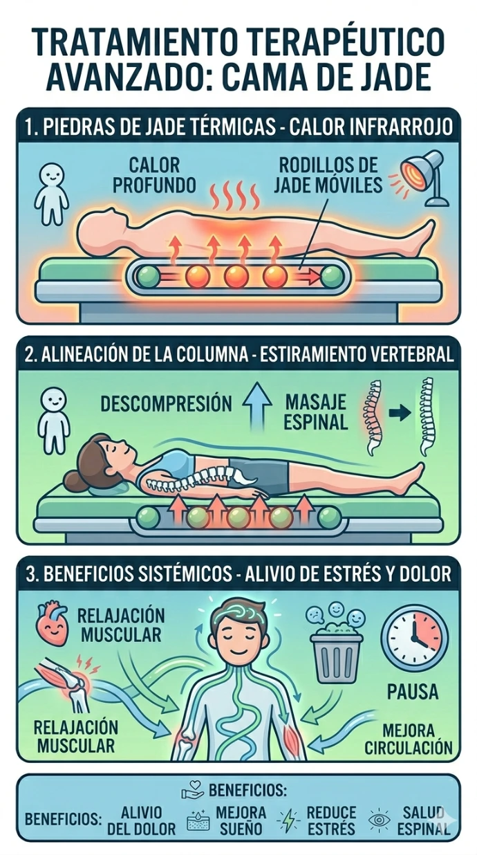 Inspirada en la medicina tradicional china, la cama de jade combina el calor de las piedras de jade con la cromoterapia y la ionización. Este tratamiento ayuda a relajar la musculatura profunda, desintoxicar el organismo, mejorar el sueño y equilibrar tu energía vital. Una experiencia única de bienestar que armoniza cuerpo y mente mientras descansas plácidamente.