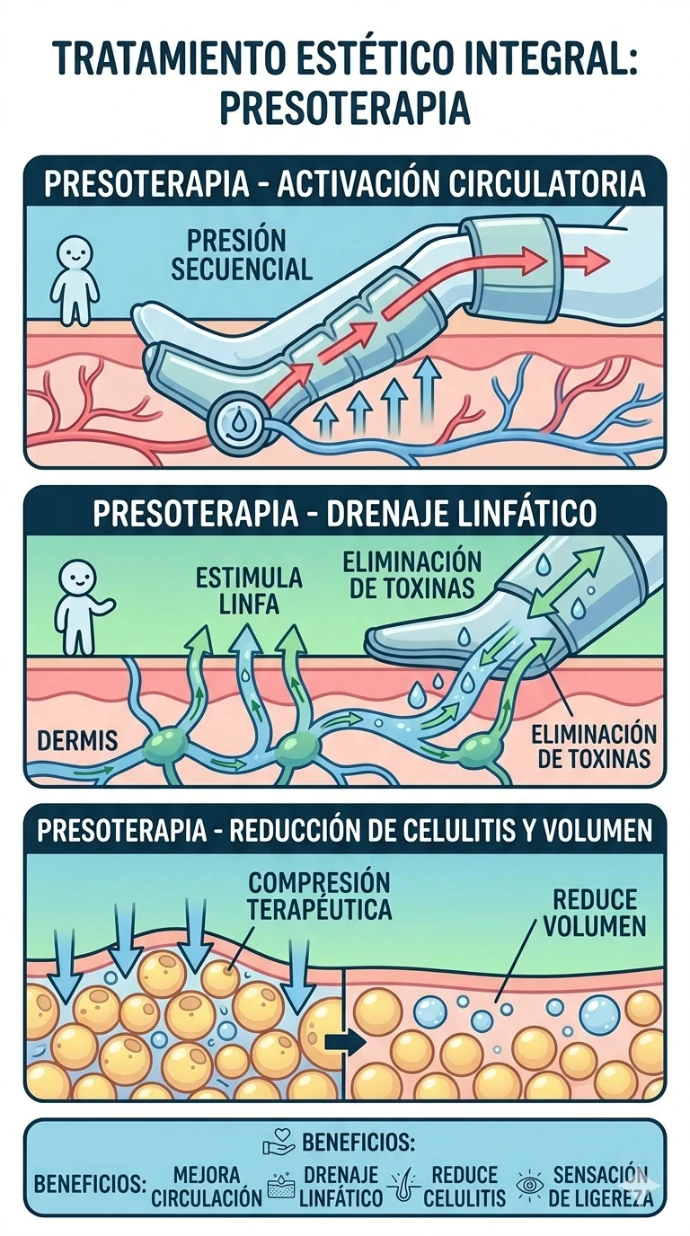 A través de un suave masaje con presión de aire, la presoterapia estimula tu sistema linfático y circulatorio. Ideal para combatir la retención de líquidos, la sensación de piernas cansadas y la celulitis. Un momento de relax que además desintoxica tu cuerpo y mejora tu bienestar general.